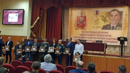 Продолжилось мероприятие церемонией памятного гашения художественной почтовой марки серии «Герои Российской Федерации», посвященной Василию Эдуардовичу Чубенко. Художественная почтовая марка уже поступила в почтовое обращение, и граждане нашей страны получили возможность использовать ее для отправки почтовой корреспонденции по стране и всему миру.