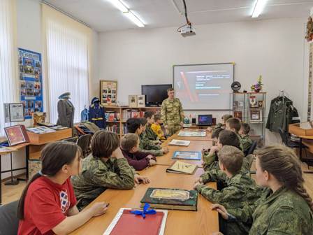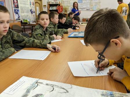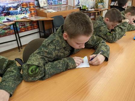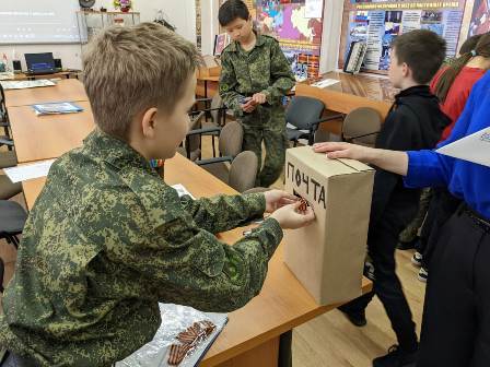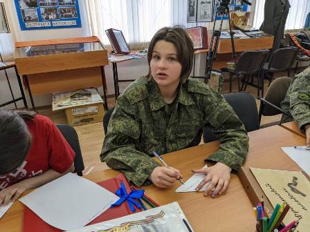 Прошло 77 лет, как закончилась Великая Отечественная война. У времени есть своя память – история. Эхо войны до сих пор не затихает в наших душах. Кадеты вместе с офицерами дивизии вспомнили основные события Великой Отечественной войны, побеседовали об отваге советских солдат, о кровопролитных битвах, о неповторимых подвигах, цена которым – жизнь. Кадетам напомнили об возникновении традиции ношения георгиевской ленточки, как правильно ее завязывать. В конце мероприятия кадеты написали письма солдатам, которые сейчас проходят военную службу в воинских частях Росгвардии. Следуя традициям наших дедов и прадедов, воевавших в годы Великой Отечественной войны, ребята сложили письма в форме треугольника. В письмах кадеты выразили признательность и сердечную благодарность военнослужащим за их доблесть во имя благополучия нашей Родины, за сохранение мирного неба в стране, за крепкую и надёжную защиту населения.