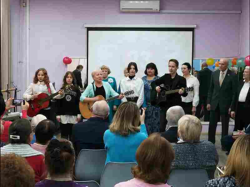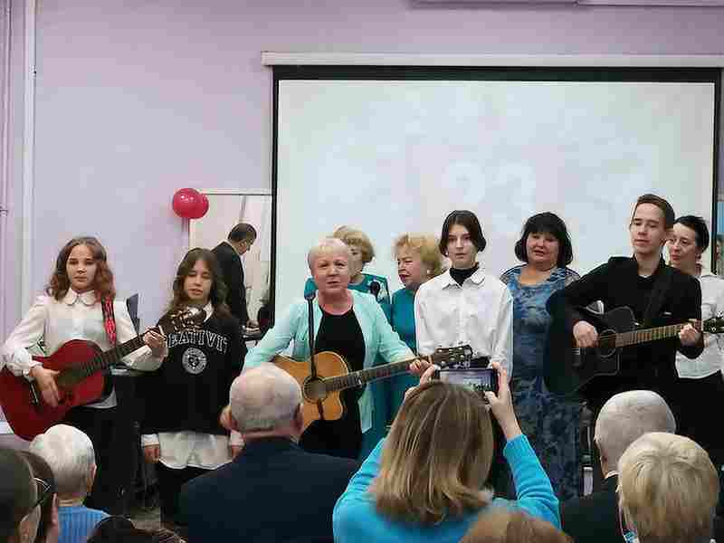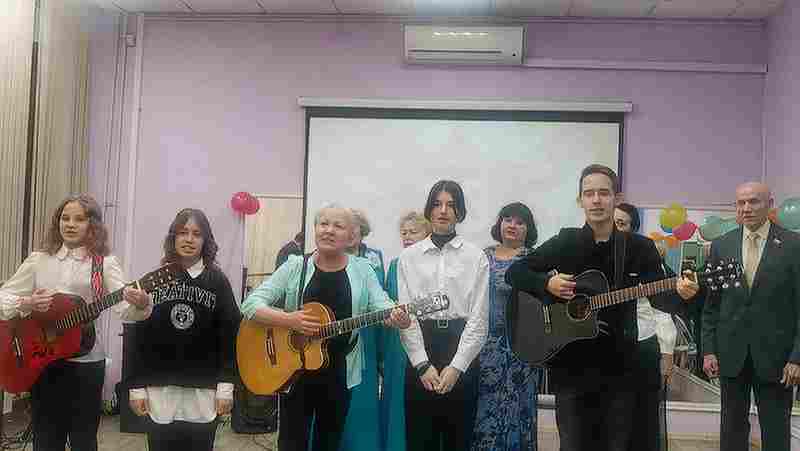 Песня в исполнении детей и руководителя «Мы желаем счастья вам» до глубины души тронула участников встречи. Хоть и совсем юные музыканты, но их неиссякаемая энергия, упорство и стремление научится игре на гитаре помогли коллективу добиться значительных результатов за короткий срок и начать выступать на сцене.